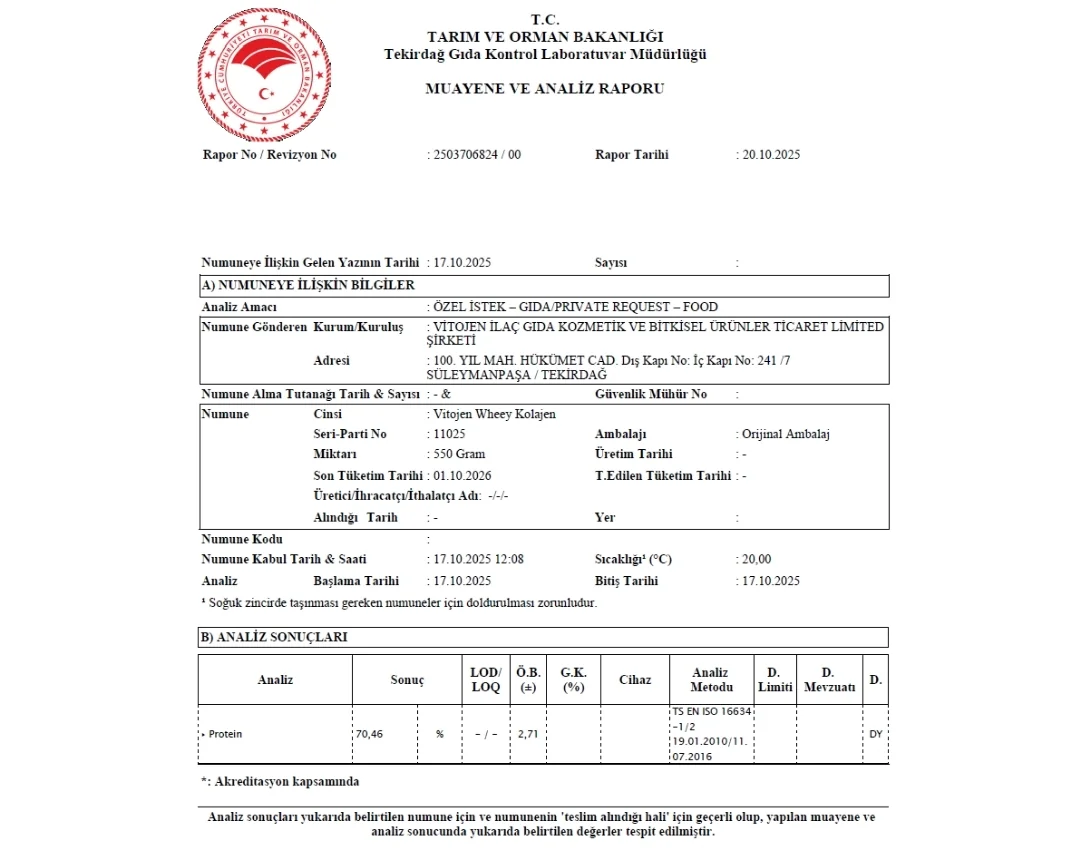 38.7 gram protein ve 8.77 gram BCAA içeren ek kolajenli Vitojen Whey, gerçek sütlü çikolata lezzetiyle
